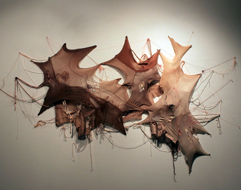 mixed textiles, worn tights and nylons, polyfil, rope, elastic, string, T-pins